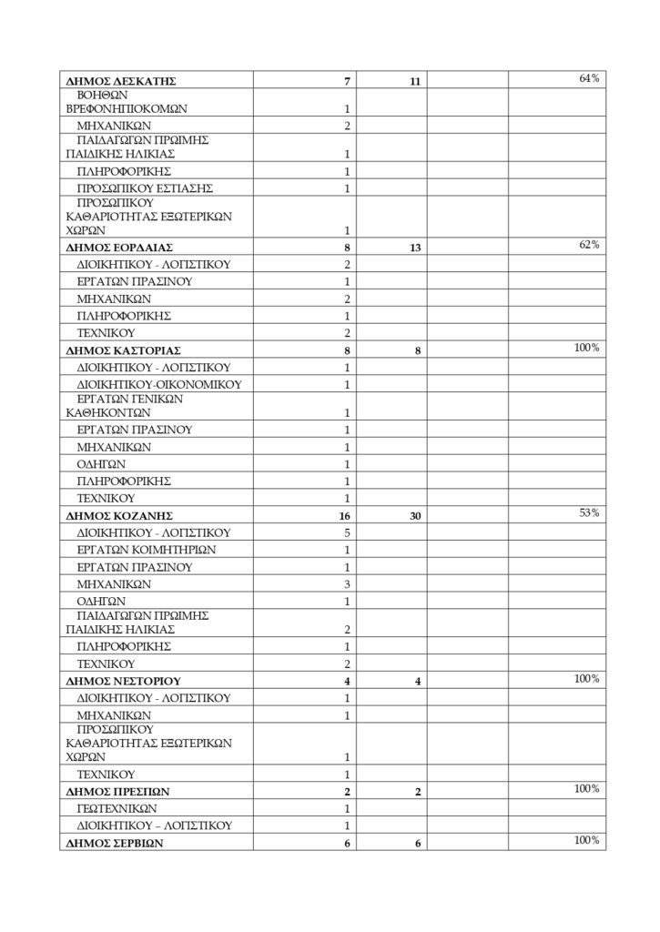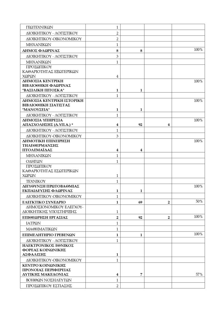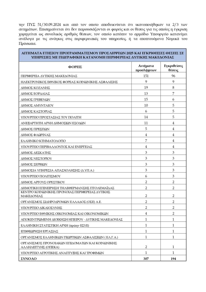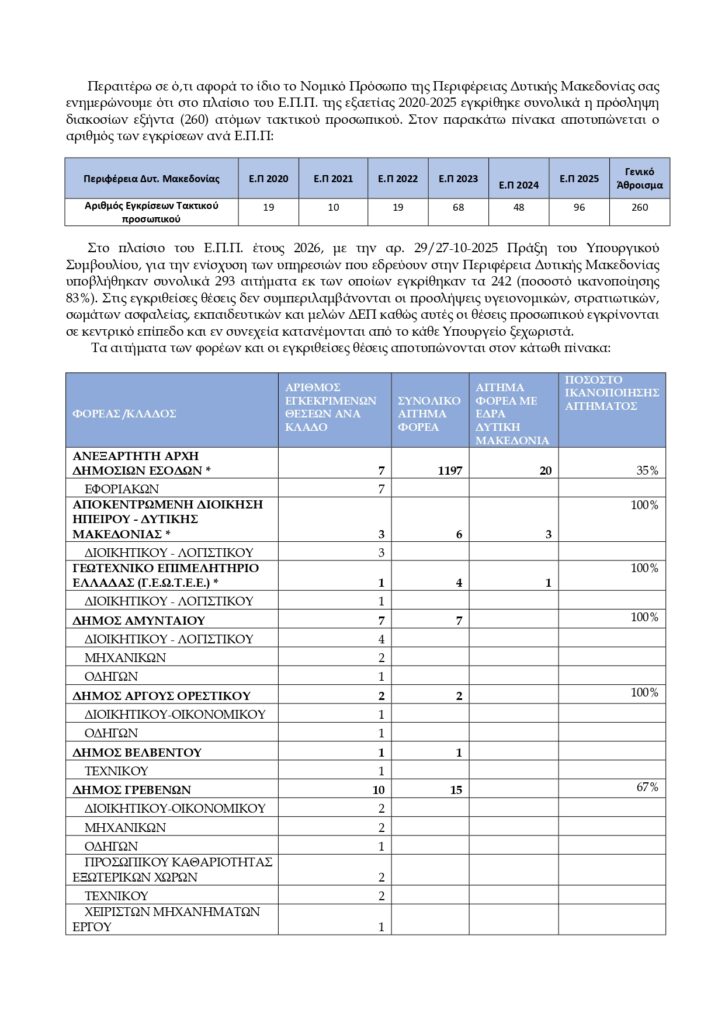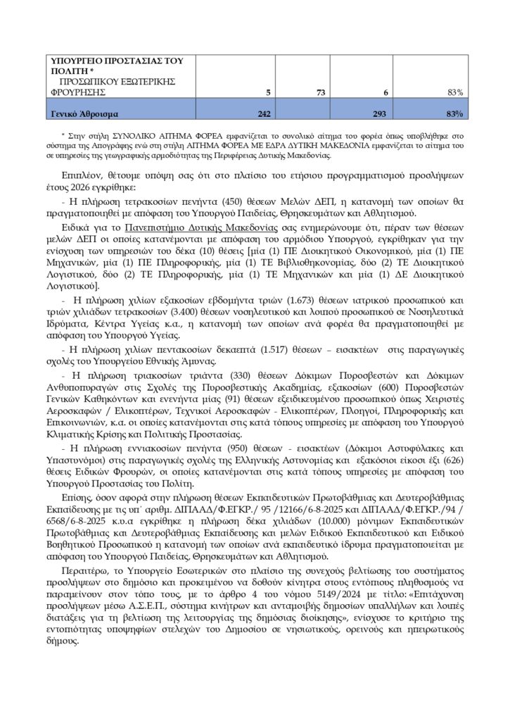 Για το 2026 υποβλήθηκαν συνολικά 293 αιτήματα για την ενίσχυση των υπηρεσιών που εδρεύουν στην Περιφέρεια Δυτικής Μακεδονίας, εκ των οποίων με την αρ. 29/27-10-2025 Πράξη του Υπουργικού Συμβουλίου εγκρίθηκαν τα 242 (ποσοστό ικανοποίησης 83%). Στις εγκριθείσες θέσεις δεν συμπεριλαμβάνονται οι προσλήψεις υγειονομικών, στρατιωτικών, σωμάτων ασφαλείας, εκπαιδευτικών και μελών ΔΕΠ καθώς αυτές οι θέσεις προσωπικού εγκρίνονται σε κεντρικό επίπεδο και εν συνεχεία κατανέμονται από το κάθε Υπουργείο ξεχωριστά.